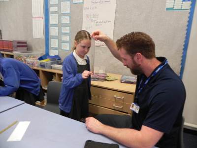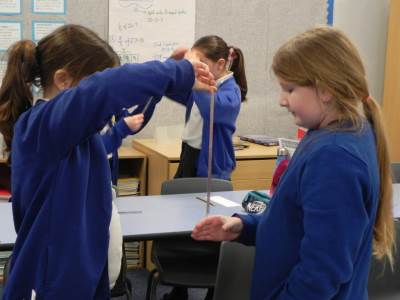 Mr Siggins, our Year 6 teacher and maths lead, focused on reaction times and reflexes. Children worked in pairs to catch a ruler as it was dropped, then calculated the mean of their results before using a conversion table to turn distance into reaction speed. Mr Siggins commented,